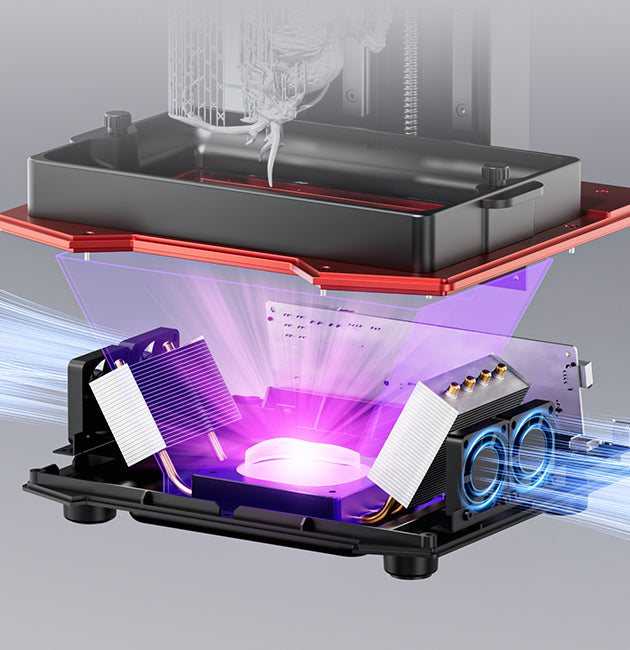 アップグレードされた放熱システムは、6本のダブル熱伝導銅管と4つの冷却ファンを光源の両側に配置し、より速い換気とより良い放熱を実現しています。これにより、プリンターが最高の状態で動作し、寿命が延びることを保証します。