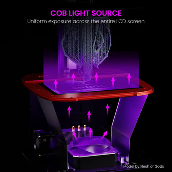 Mars 4 は、モノクロLCDの下に隠された36個のLEDで構成される強力なCOB光源を採用しており、これらが連携してビルド エリア全体に非常に均一なUV光ビームを提供します。 その結果、非常に正確で滑らかな表面を備えたモデルが印刷されます。