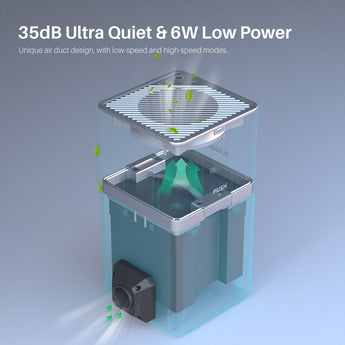 6Wの超低消費電力と最適化されたファン構造により、空気清浄機は35dBの低騒音で動作し、浄化プロセスのエネルギー効率が向上し、より静かになります。 印刷作業に集中し、空気清浄機を横で静かに稼働させてください。