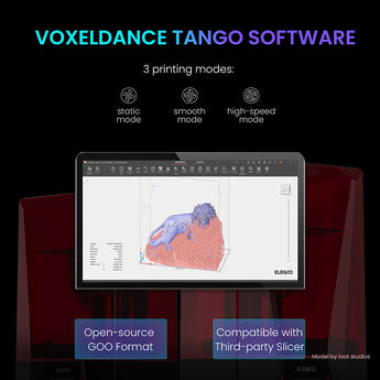 Voxeldance Tangoソフトウェアは、印刷効率を高めるために、静的モードと動的印刷モード(動的モードは、スムースモードと高速モードを含む)を提供します。オープンソースのGOOスライスファイル形式により、CHITUBOXやLychee Slicerなどのサードパーティのスライスソフトウェアを使用することができ、より柔軟で便利です。