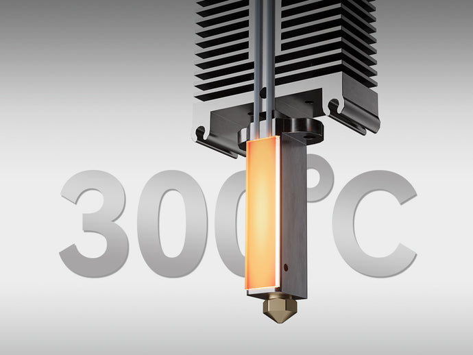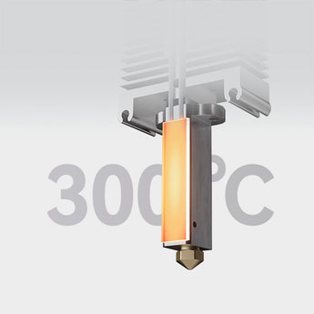 OrangeStorm Gigaは、最高300°Cに達する高品質な真鍮ノズルを搭載しており、高温材料に最適です。デュアルギアダイレクトエクストルーダーとチタニウムヒートブレイクにより、フィラメントの流れが安定し、60Wのセラミックヒーターが迅速で安定した加熱を提供します。