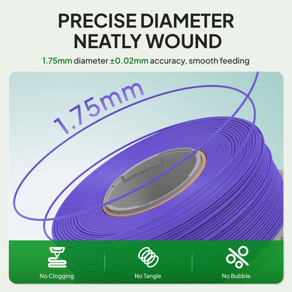 ELEGOO PLA ベーシックは、使い捨てスプールを排除したリフィル式設計を採用。プラスチック廃棄物を大幅に削減し、再利用可能なスプールの使用を促進します。品質や使いやすさを損なうことなく、環境に優しいサステナブルな印刷を実現します。