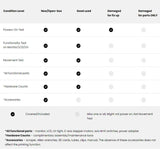 • 傷物 -> ユニットには不具合があり(例:LCDが壊れている)、完全に機能するためには修理と手直しが必要です。使用感、擦り傷、引っかき傷、へこみ、ひび割れなどの外観上の問題が見られることが一般的です。ユニットは電源が入りますが、小さな部品、ハードウェア、またはアクセサリーの一部または全てが欠けている場合があります。お客様は、1つの機能するユニットを作成するために、当社から最大2つのユニットを購入する必要があるかもしれません。修理プロジェクトを探している経験豊富なDIY専門家にとって、これは優れたオプションです。